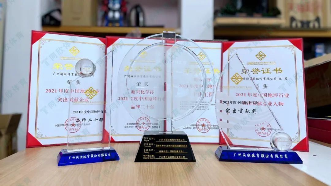 凭借强大的品牌实力,同欣体育在本年度的推优颁奖仪式中一举包揽了“2021年度中国地坪行业品牌二十强”、“2021年度中国地坪行业十佳工程”、“2021年度中国地坪行业突出贡献企业”、“2021年度中国地坪行业突出贡献企业人物”4个大奖!