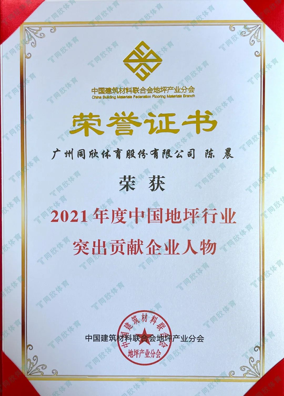 同欣体育副总裁陈晨博士荣获2021中国地坪行业突出贡献企业人物奖,证明了同欣体育的产品研发实力与生产营销实力,是对地坪行业人才精英的极大认可,为同欣体育乃至整个地坪行业的发展提供了更强大的动力。